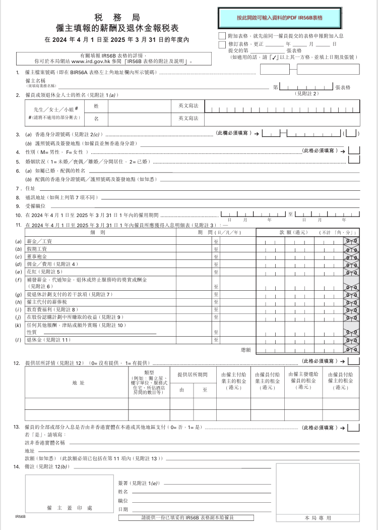 | IR56F/G | 雇员行将停止受雇/离港的通知书 | 通知香港税务局,某位雇员已经离职或即将离开香港。确保雇员在离开香港前已缴清所有税务责任 | ·IR56F:雇主资料、雇员资料、离职日期、在职期间的已支付薪酬、最后一次支付薪酬的日期、雇员将要居住的地址(离港后)·IR56G:与IR56F类似,重点在于“即将离港”,雇主需要承诺在支付任何薪酬给即将离港的雇员之前,已通知税务局 | ·IR56F:雇主支付雇员的最后一次薪酬的 7 天前提交·IR56G:雇员预期离港的1个月内 |